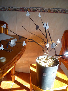 Árvore do Halloween, recortei caveiras e fantasmas e colei nuns ramos secos
